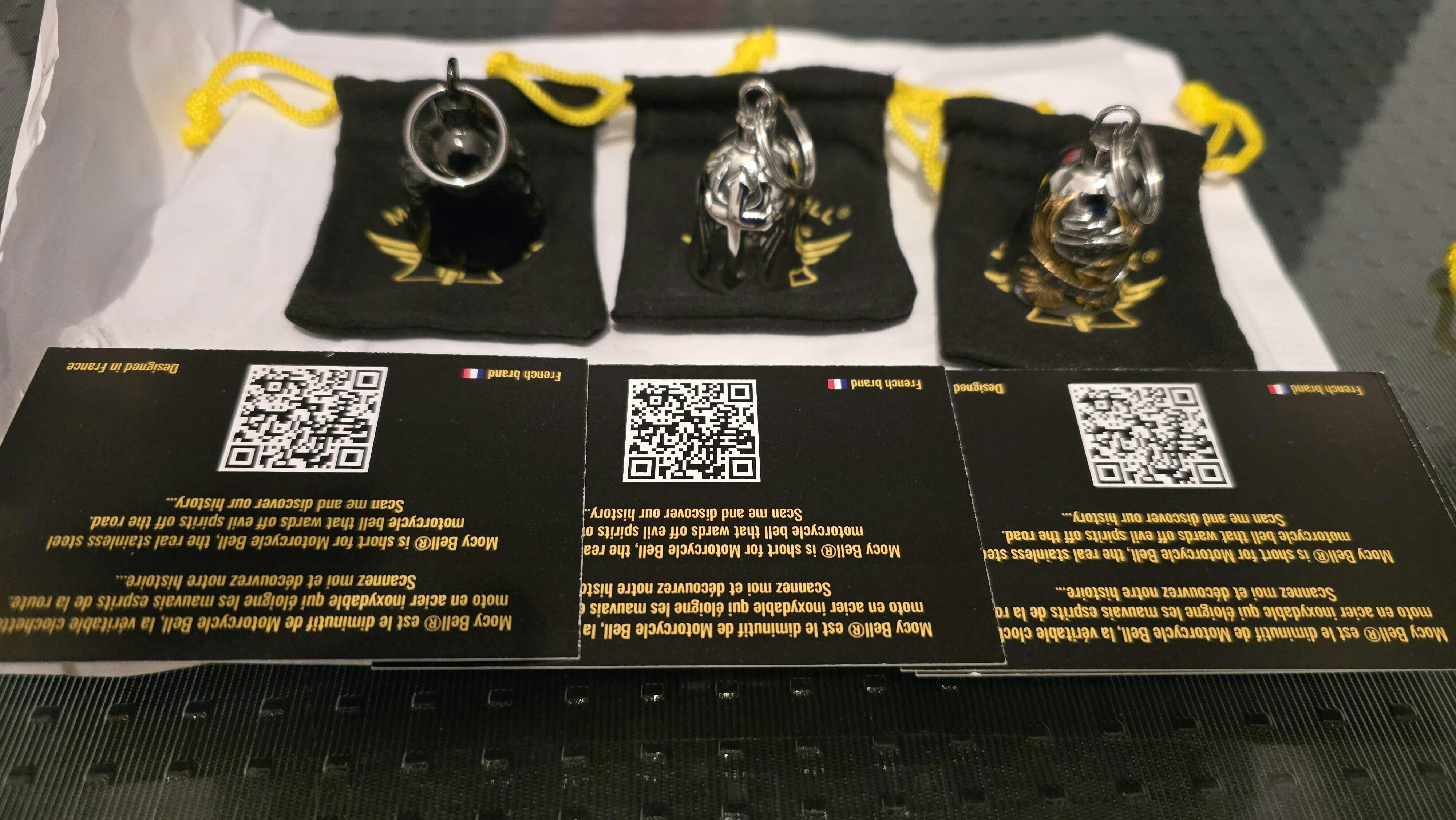 Chaque clochette Ride Fast Ride Safe noire titane est livrée avec son pochon MocyBell noir et jaune en microfibre, ainsi que sa carte d’authenticité. C’est un cadeau fort de sens entre motards. Plus qu’un accessoire, c’est un symbole de protection, de respect et de fraternité sur la route.